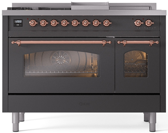 Introducing the new Nostalgie II 48" dual fuel range, a classic addition with a touch of innovation to any kitchen. This range feature sealed burners equipped with total black brass flame spreader that has a non-stick nanotechnological coating, heavy cast iron grates, 3.5 + 1.52 cu. ft. total double oven capacity and soft closing door system.Read More