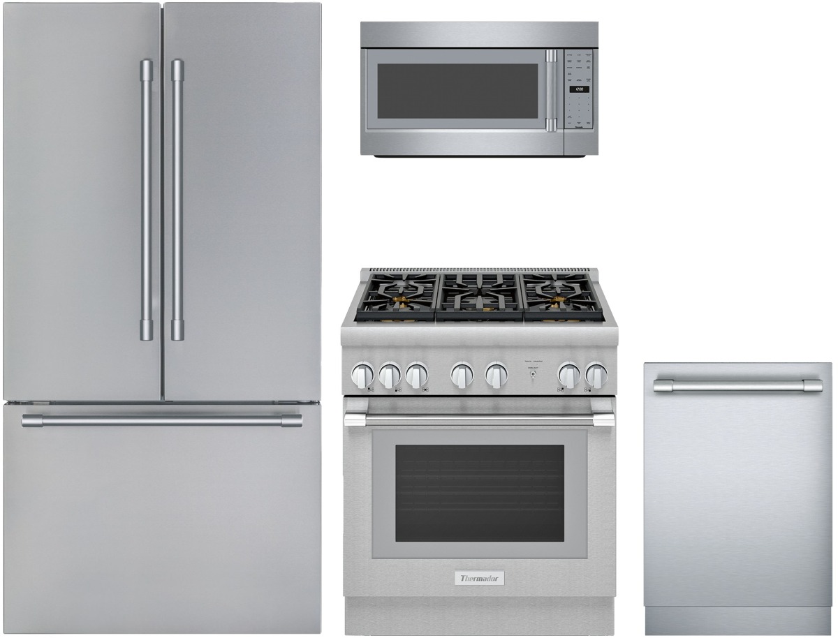 Thermador® 4 Piece Stainless Steel Kitchen Package with a french door refrigerator, built in dishwasher, pro style gas range and over the range microwave.Read More